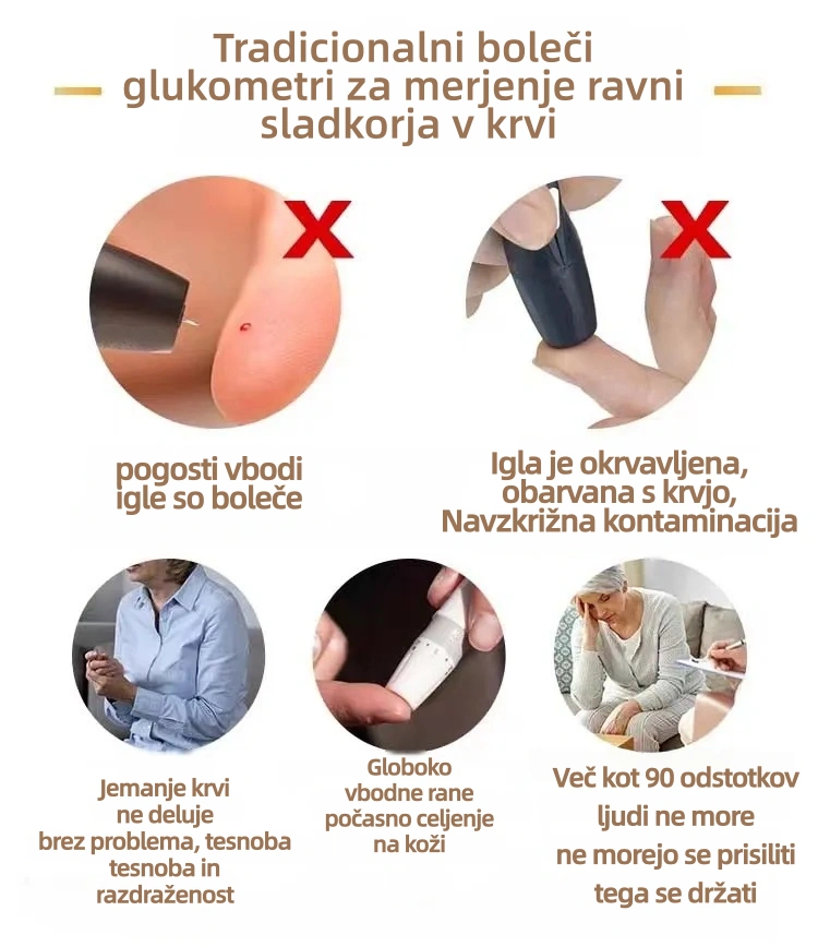 Nič več invazivnega in tveganega testiranja krvnega sladkorja! Varno testirajte krvni sladkor brez tveganja navzkrižne okužbe ali poškodb prstov z iglami.